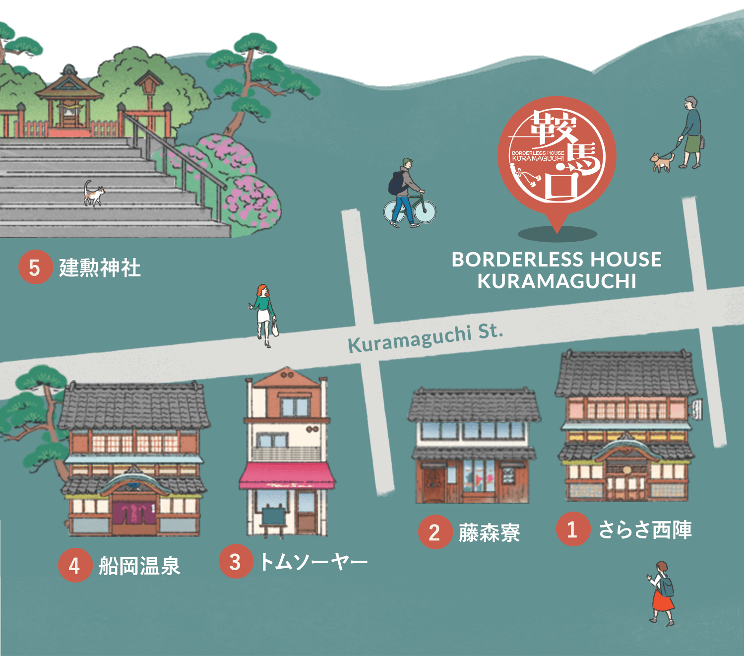Experience living in a multicultural and multigenerational environment. Collaborate with nearby stores, participate in community events, and enjoy a fulfilling life at Borderless House Kyoto-Kuramaguchi!