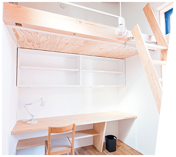 The single rooms are equipped with a desk, bed (in the loft part), and storage space.