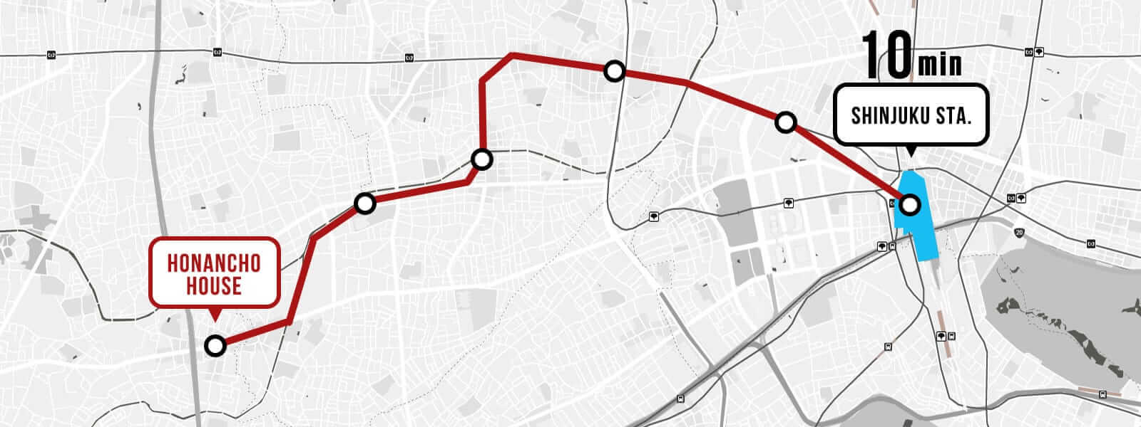 From the closest station to the house, Honancho Station, the Tokyo Metro Marunouchi Line takes you to Shinjuku in 10 minutes.